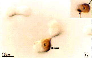 The figure to the right shows how a receptor-ligand complex can be detected at the light microscopic level. The ligand is attached to biotin and then it binds the target cell. It is detected by an avidin peroxidase conjugate which is visualized by a reaction for the enzyme peroxidase. This protocol is called "affinity cytochemistry". In this figure, the biotinylated ligand is labeled black (note that it is capping on one of the cells). The orange label defines the protein in the cell by immunocytochemistry. For more information, consult our Affinity Cytochemistry Web page