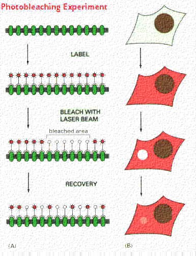 In the next experiment, the label on the membrane is "bleached" in one area with a laser beam. The figures to the right show the results. Bleaching removes the label on the protein and results in a clear area (area of no label) in a completely labeled cell (see following figure).