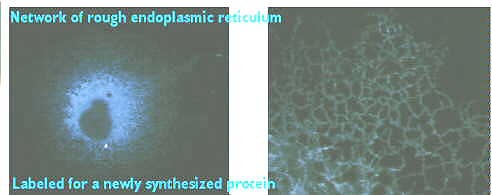 Rough endoplasmic reticulum forms a branched reticulum that expands as the cell becomes more active in protein synthesis. Sometimes the reticulum branches out. Other times, the cisternae dilate and form large sacs that fill the cell. The above photograph, taken from your text, shows the reticulum delineated by immunolabeling for newly synthesized protein (labeled fluorescent blue in this photo).
