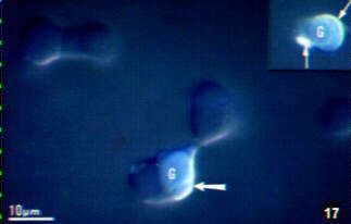 One way to test the first hypothesis would be to determine if the transitional "somatogonadotrope" binds the neuropeptide Gonadotropin releasing hormone (GnRH). We used dual affinity cytochemistry labeling protocols to detect GnRH on subsets of pituitary cells and found that cells with GH antigens did increase binding (to about 40% of GH cells) just before ovulation. At the same time, there was an increase in the percentages of gonadotropes that bound GnRH to 90% of gonadotropes. This supports the hypothesis that these GH cells may be transitional gonadotropes. The figure to the left illustrates the dual-labeling data. The figure was reproduced as a negative image to show the labeling better. Growth hormone cells (G) are immunolabeled blue for growth hormone antigens. The white label (arrows) shows that this cell also binds the neuropeptide, gonadotropin releasing hormone (GnRH). The labeling is mostly on the cell periphery. This releasing hormone may help convert these cells to transitional gonadotropes just before ovulation.