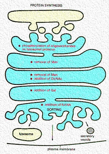 The Golgi Complex is compartmentalized. Phosphorylation occurs in the Cis region. In other regions, different types of carbohydrates are added as a glycoprotein passes through the cisternae. This figure illustrates the different regions where sugars like mannose (man), galactose (gal), etc are added. The final sorting is done in the Trans Golgi complex.