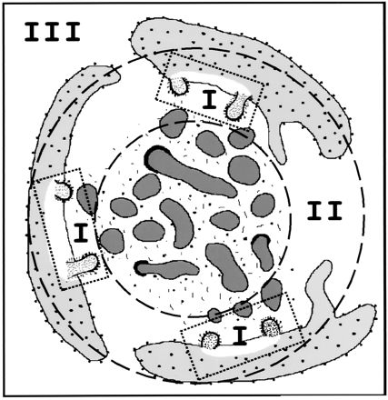 Tier I shows budding from ER that is arranged facing a central zone at one end of the Golgi complex. These buds become vesicles and are coated with COPII protein coats. The above drawing shows an actual interface between the ER and the Golgi complex. The "Export complex" is seen at the top of the drawing. Note that the vesicle are moving to contribute to the cis-Golgi network of vesicles and cisternae.