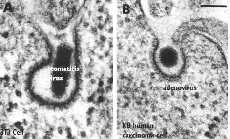 In contrast, this micrograph shows a figure which looks something like an omicron, however, this view is showing receptor mediated endocytosis of virus particles. In both cases, the membrane is coated with clathrin and these represent classical receptor mediated endocytosis profiles. Most ligands cannot be visualized by themselves, like a virus particle. Therefore, the cytochemist must attach label to the ligand. Alternatively, the cytochemist could immunocytochemically detect the receptor with antibodies that recognize the extracellular domain. This figure was taken from Endocytosis, Edited by Ira Pastan and Mark C. Willingham, Plenum Press, N.Y., 1985