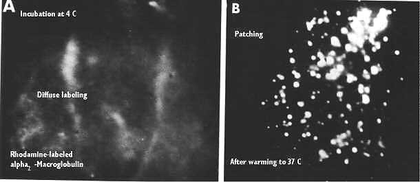 Finally, temperature is important to the overall patching and capping process discussed during the lecture on membranes. There we showed that, after they are bound, Membrane Receptors move laterally in the plane and groups of receptor-ligand complexes may actually coalesce in a patch and eventually in a cap. Antibodies are good examples of receptors that react this way. The left hand figure (above) shows what happens if the temperature is 4 C. There is a diffuse labeling. Warming the cells immediately produces patching.